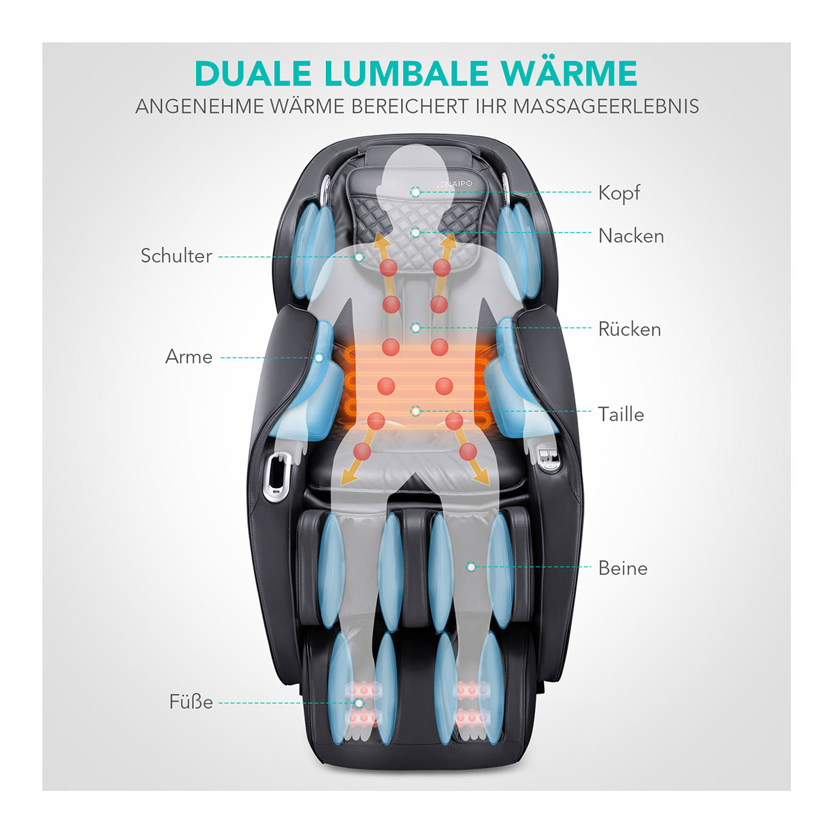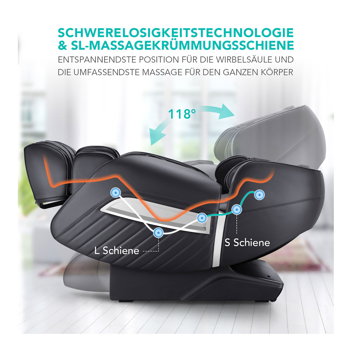- 1-Klick-Schwerelosigkeits-Funktion: 2 Schwerelosigkeitspositionen. Die Massageschiene folgt der Krümmung Ihrer Wirbelsäule während die Massagerollen jede Muskelgruppe erreichen