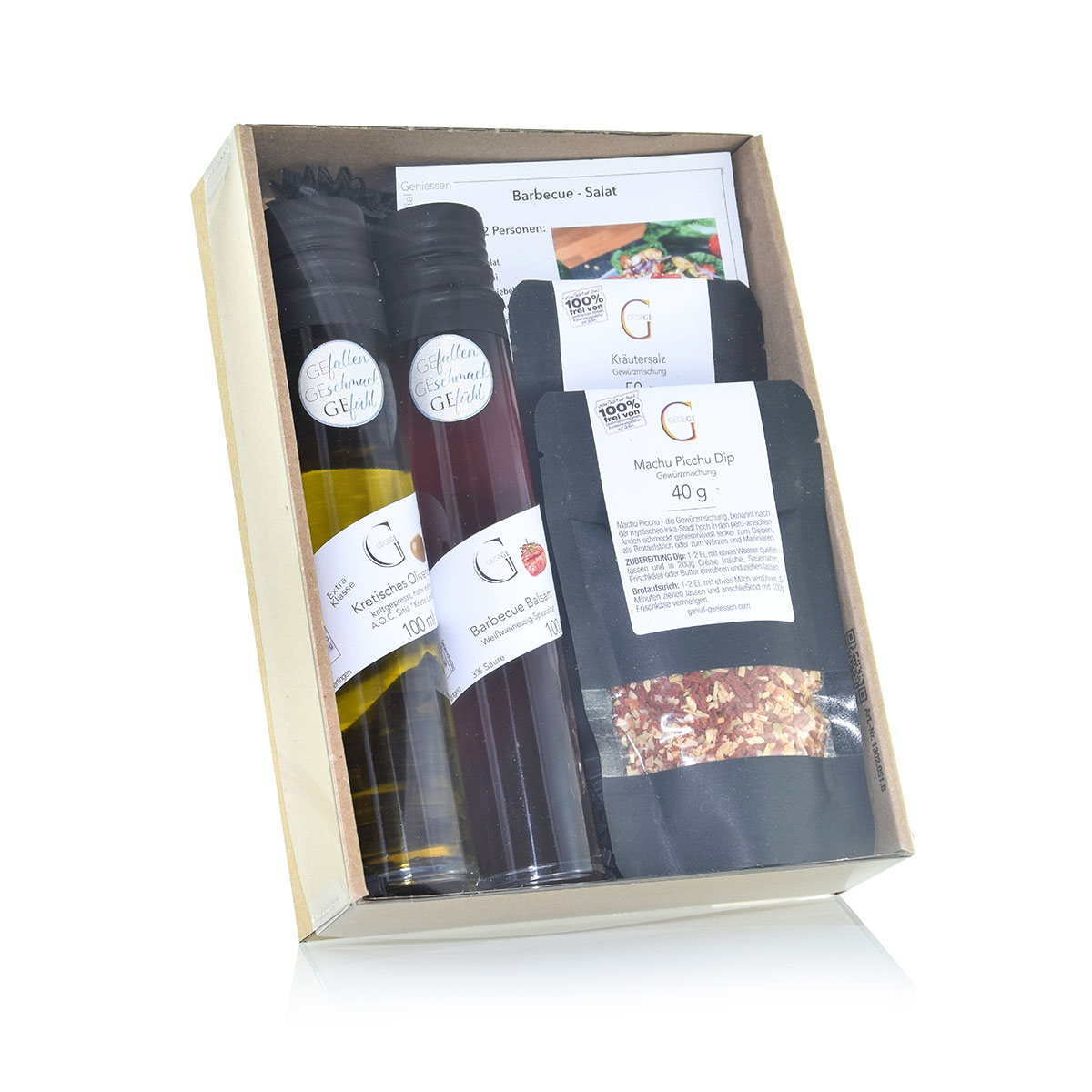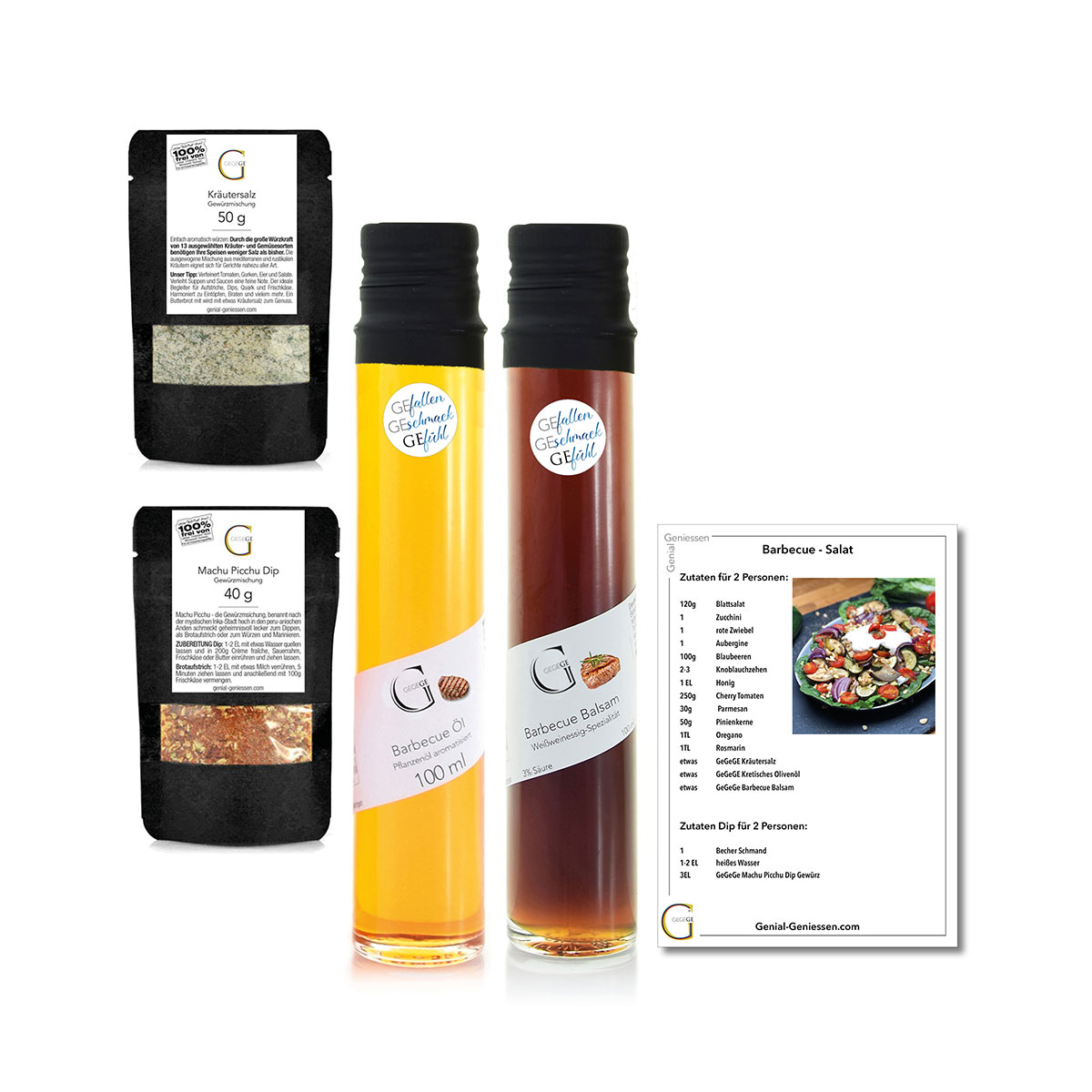 Im „Kleinen Wintergrill Genuss“ Geschenkset steckt alles, was man für ein leckeres BBQ-Event braucht: Zwei exklusive Dip Gewürze für Fleisch oder Gemüse und Fingerfood, ergänzt durch Barbecue Öl und Barbecue Balsam zum Marinieren deines Grillguts und obendrauf kommt noch eine Rezeptkarte für einen super leckeren Barbecue Salat. Alle Artikel im Set sind übrigens auch als Würze in der Alltagsküche sehr gut geeignet.