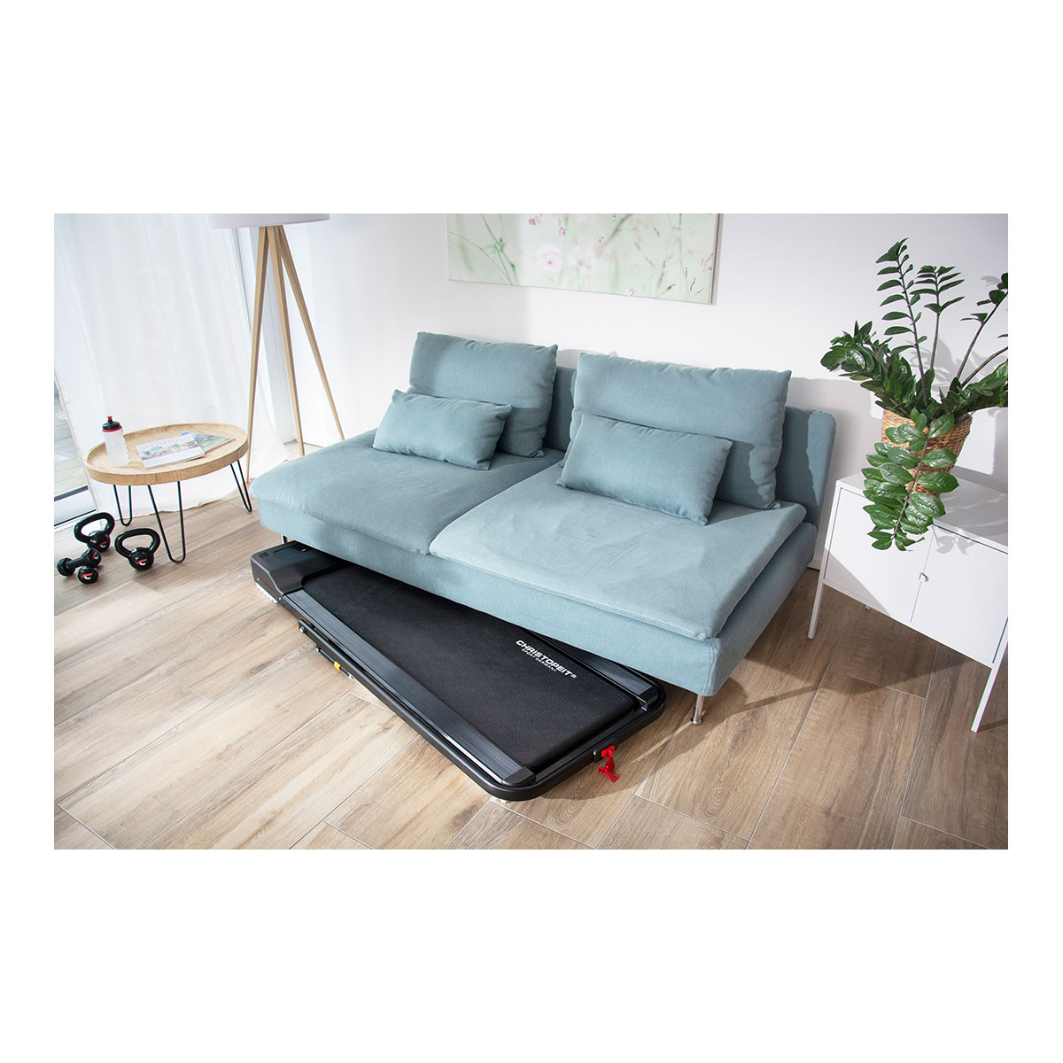 Das Laufband lässt sich ohne großen Aufwand und im Handumdrehen aufbauen oder zusammenlegen und kann nach Gebrauch leicht und platzsparend verstaut werden. Es ist mit seiner Höhe von 13 cm ultraflach zusammenklappbar und kann daher fast überall verstaut werden.